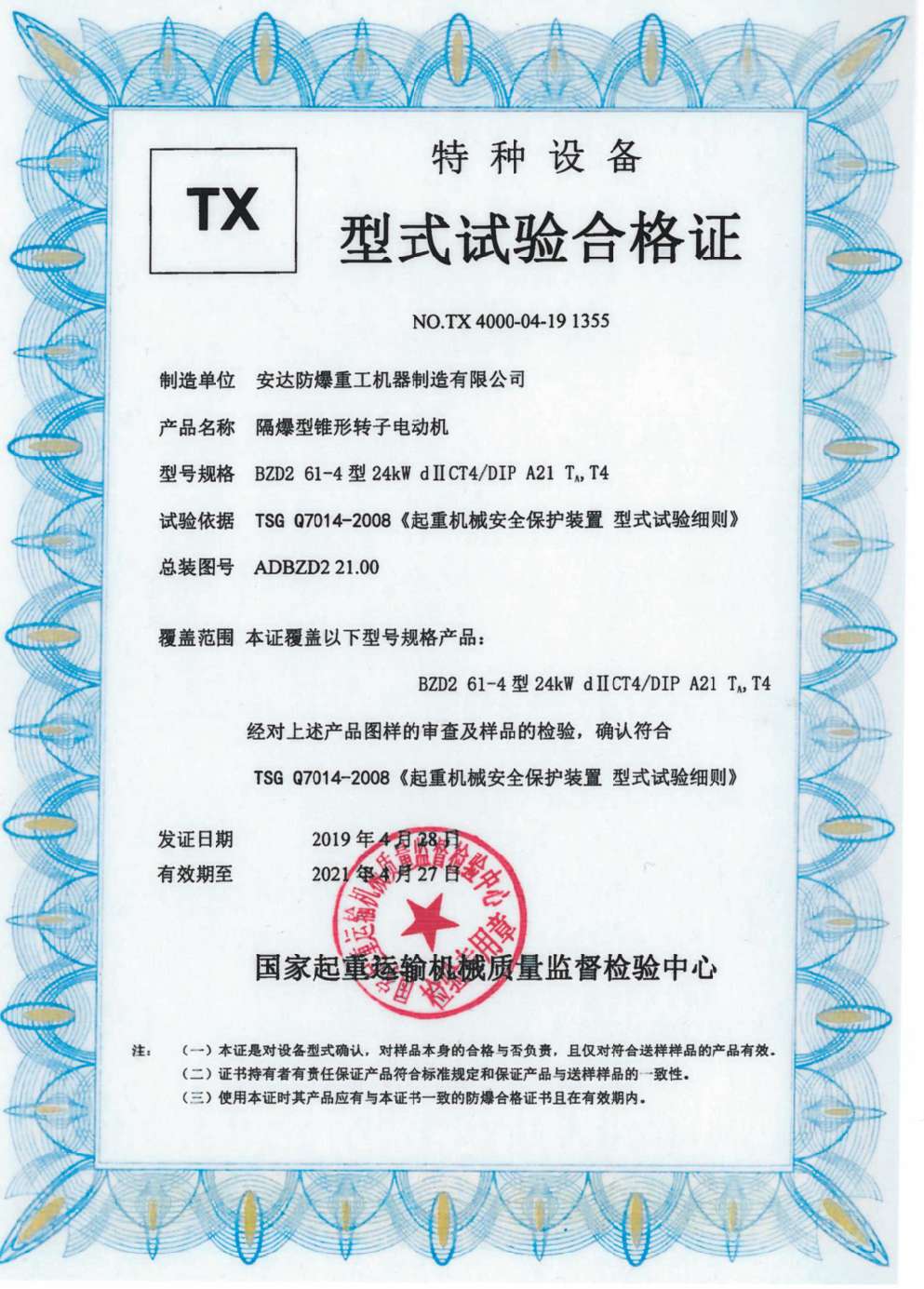 榮譽(yù)資質(zhì) 隔爆型錐形轉(zhuǎn)子電動(dòng)機(jī) TX型式試驗(yàn)合格證