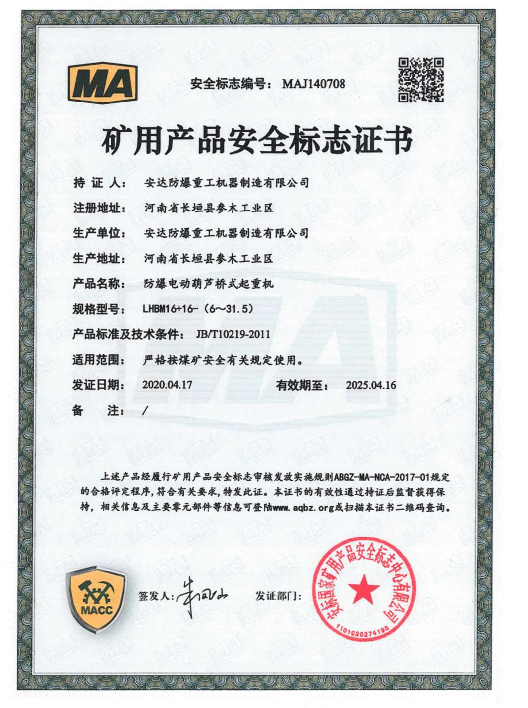 | 發(fā)證機(jī)構(gòu): | 安標(biāo)國家礦用產(chǎn)品安全標(biāo)志中心有限公司 | 發(fā)證時(shí)間 : | 2020-04-17 |