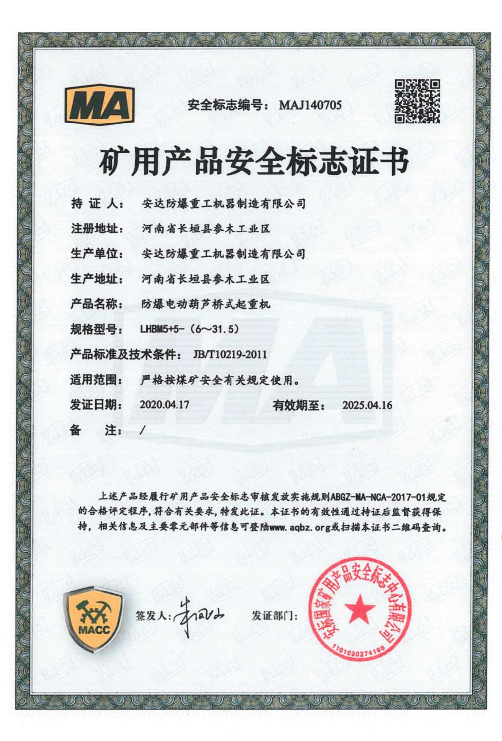 防爆鋼絲繩葫蘆橋式起重機 礦用產(chǎn)品安全標志證書