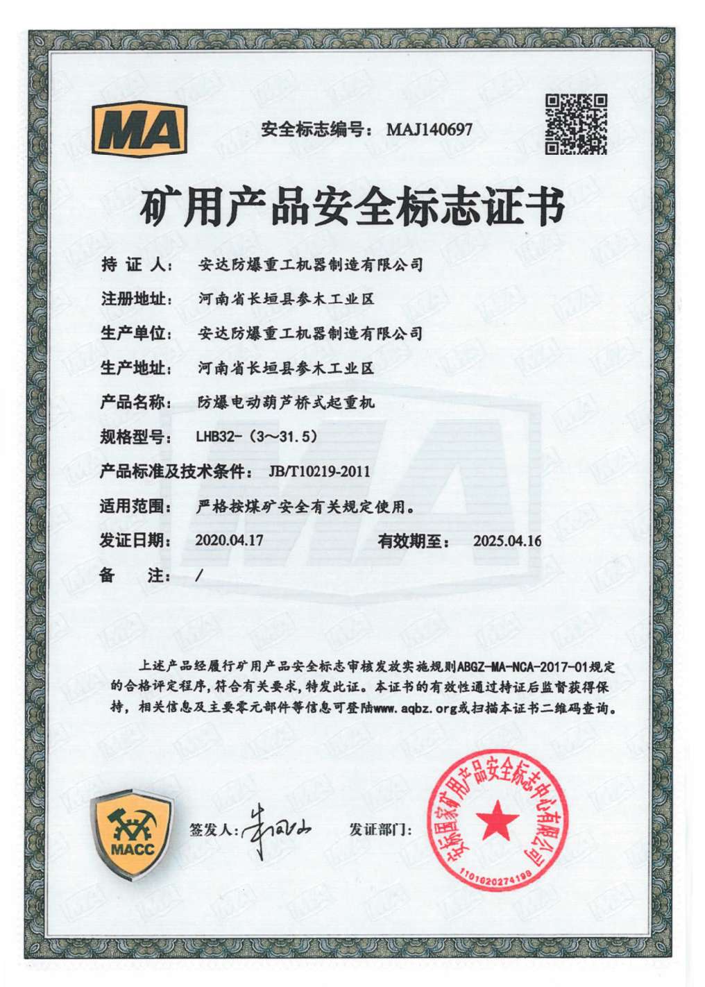 | 發(fā)證機(jī)構(gòu): | 安標(biāo)國家礦用產(chǎn)品安全標(biāo)志中心有限公司 | 發(fā)證時間 : | 2020-04-17 |