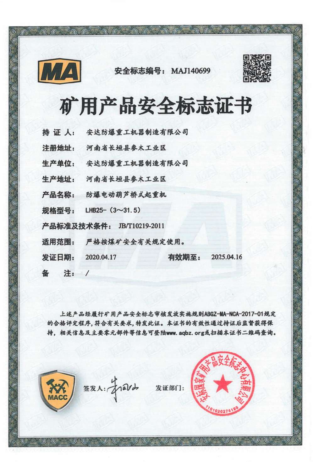 榮譽(yù)資質(zhì) 防爆鋼絲繩葫蘆橋式起重機(jī) 礦用產(chǎn)品安全標(biāo)志證書(shū)