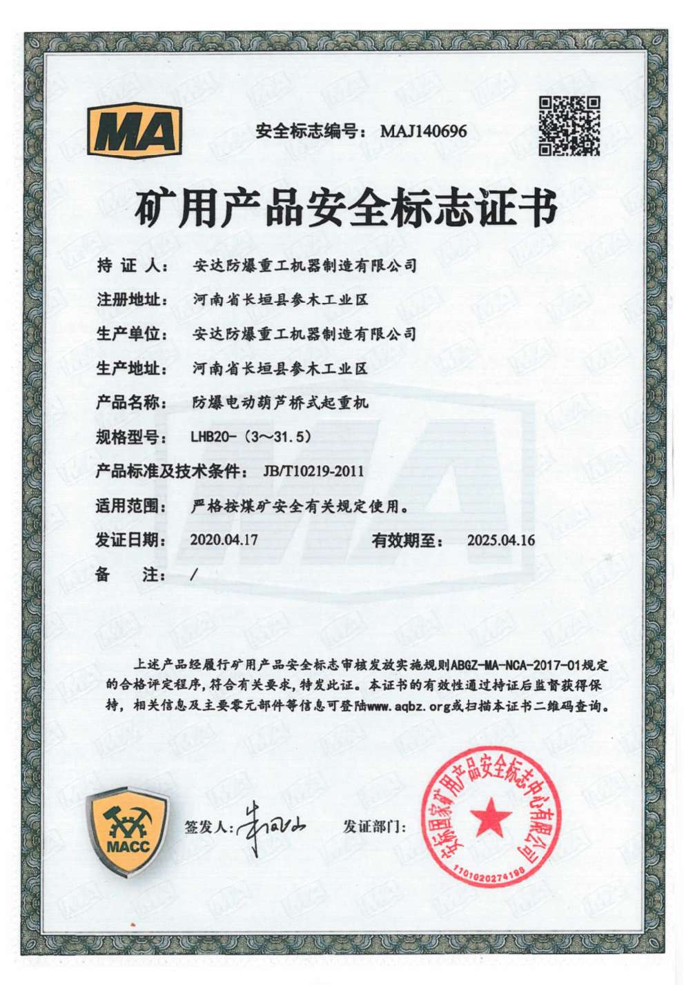 榮譽資質(zhì) 防爆鋼絲繩葫蘆橋式起重機(jī) 礦用產(chǎn)品安全標(biāo)志證書
