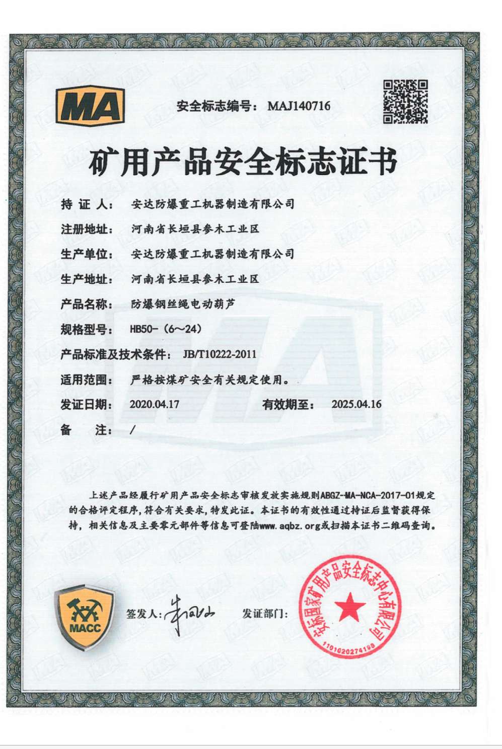 榮譽(yù)資質(zhì) 防爆鋼絲繩葫蘆橋式起重機(jī) 礦用產(chǎn)品安全標(biāo)志證書(shū)