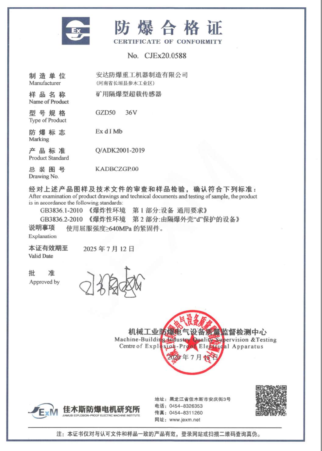 | 發(fā)證機(jī)構(gòu): | 機(jī)械工業(yè)防爆電氣質(zhì)量監(jiān)督檢測(cè)中心 | 發(fā)證時(shí)間 : | 2020-07-13 |