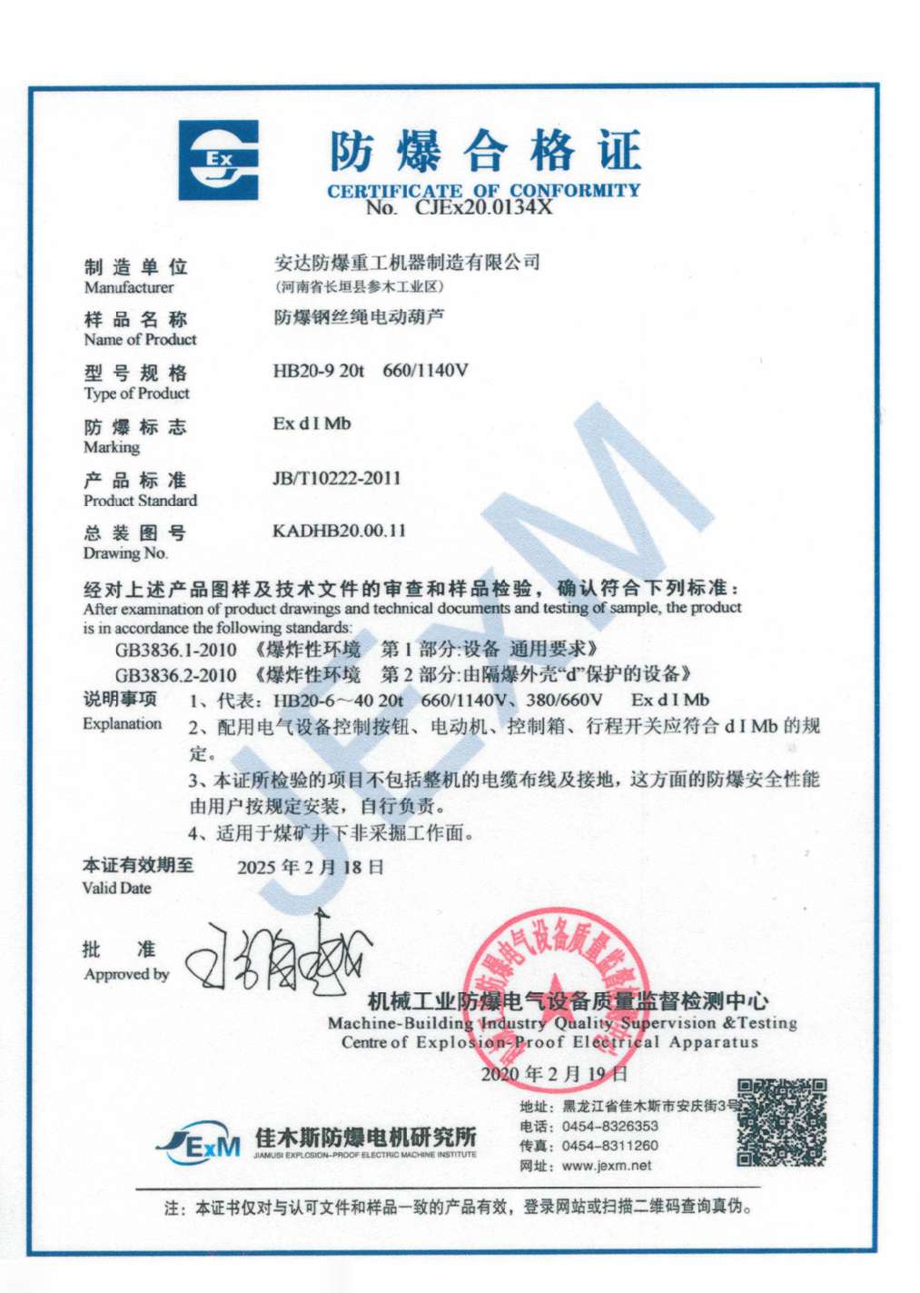 | 發(fā)證機(jī)構(gòu): | 機(jī)械工業(yè)防爆電氣質(zhì)量監(jiān)督檢測中心 | 發(fā)證時(shí)間 : | 2020-02-19 |