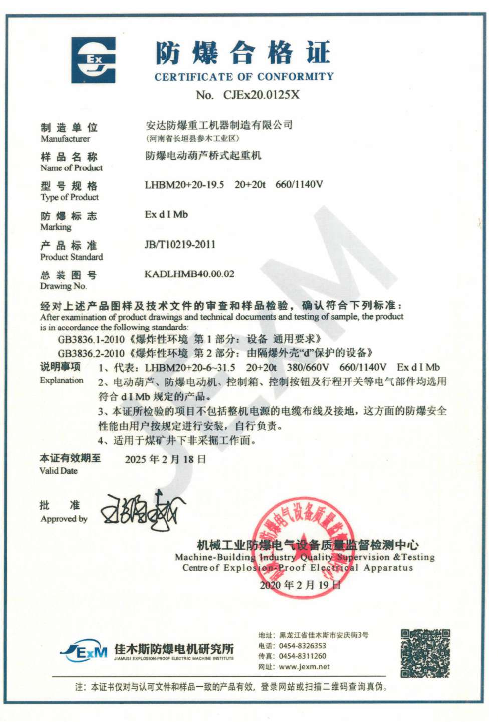 » 防爆電動葫蘆橋式起重機 防爆合格證
