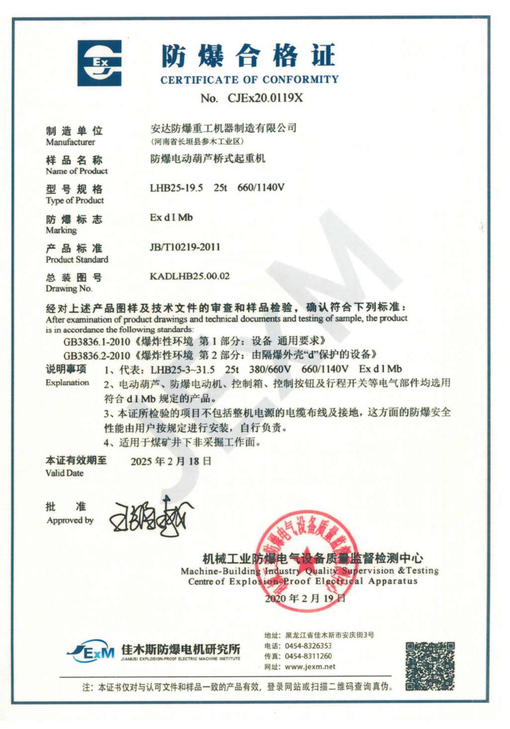 榮譽(yù)資質(zhì) 防爆電動(dòng)葫蘆橋式起重機(jī) 防爆合格證