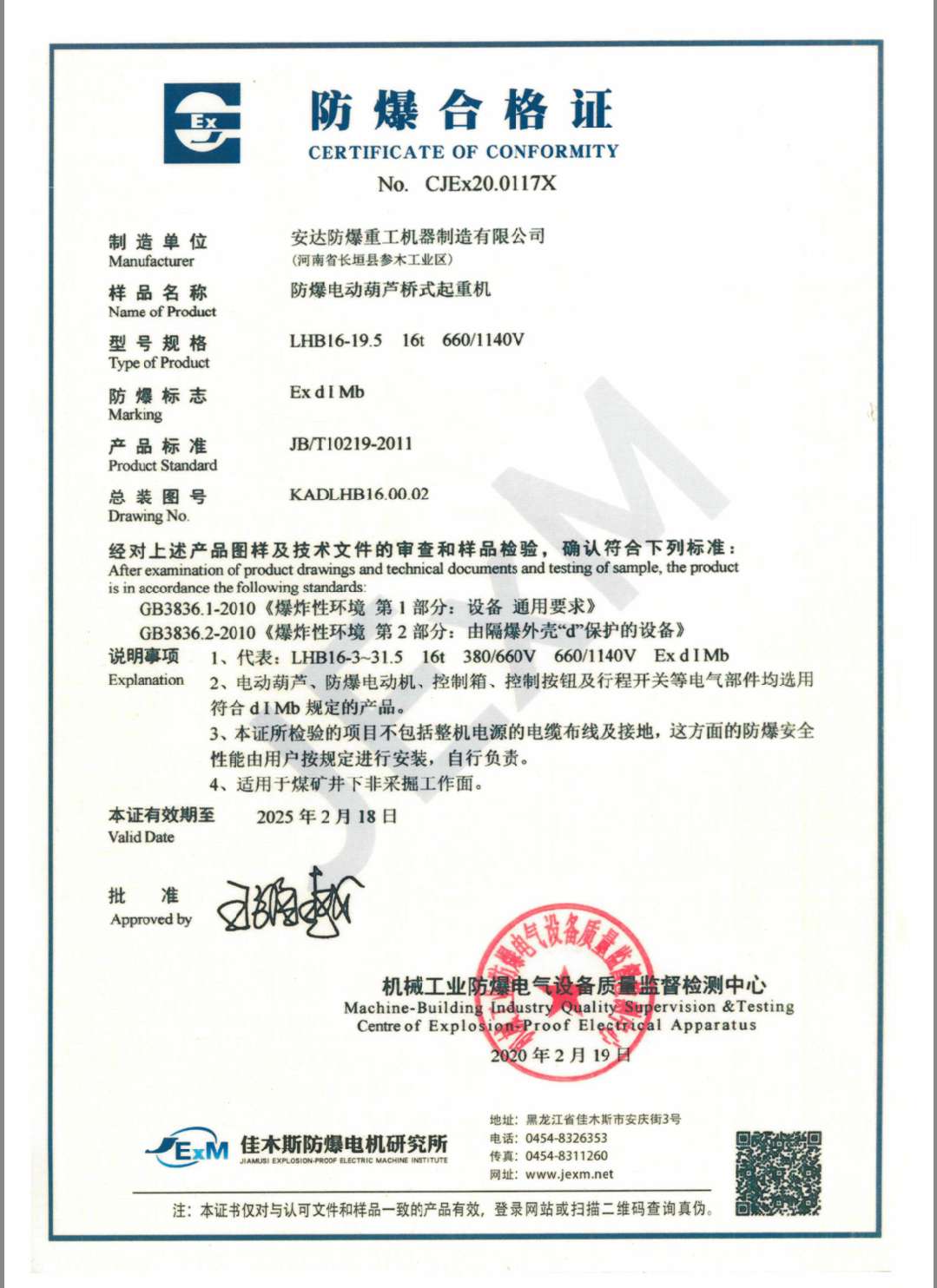 榮譽(yù)資質(zhì) 防爆電動(dòng)葫蘆橋式起重機(jī) 防爆合格證