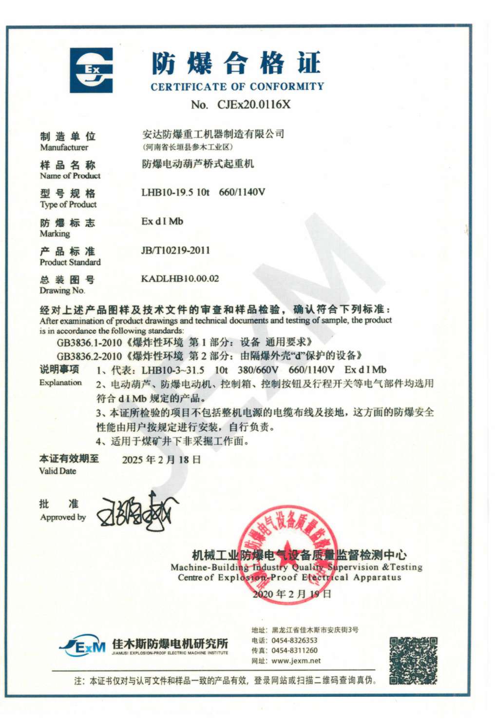 | 發(fā)證機(jī)構(gòu): | 機(jī)械工業(yè)防爆電氣設(shè)備質(zhì)量監(jiān)督檢測(cè)中心 | 發(fā)證時(shí)間 : | 2020-02-19 |