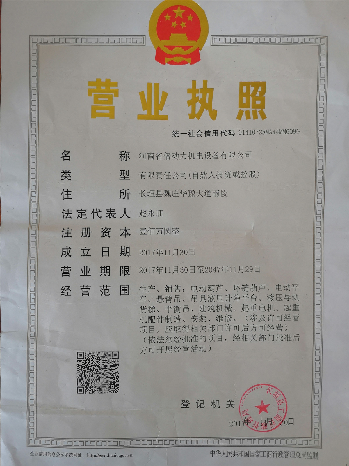 | 發(fā)證機(jī)構(gòu): | 長(zhǎng)垣縣工商行政管理局 | 發(fā)證時(shí)間 : | 2017-11-30 |