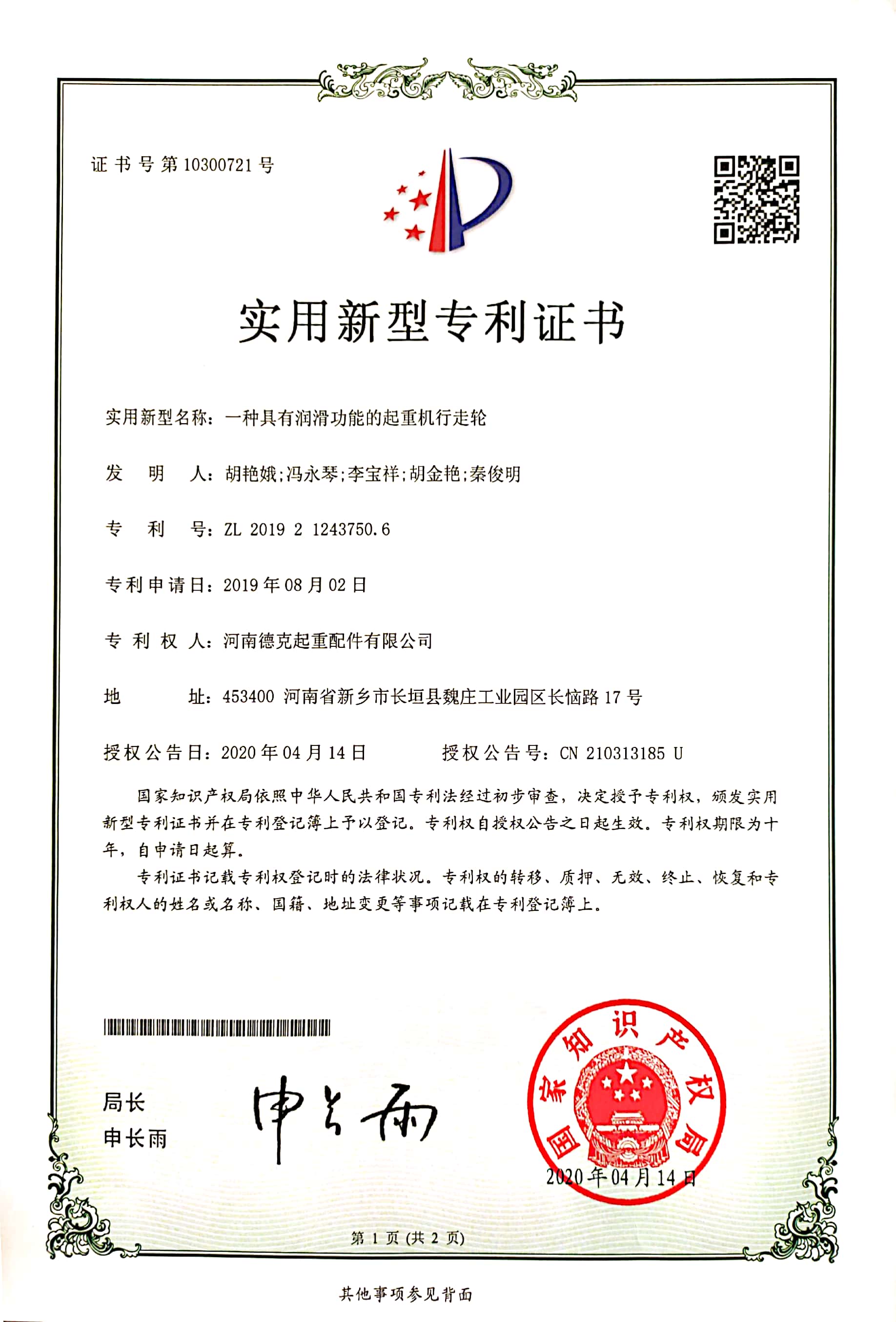 證書(shū)介紹 一種具有潤(rùn)滑功能的起重機(jī)行走輪