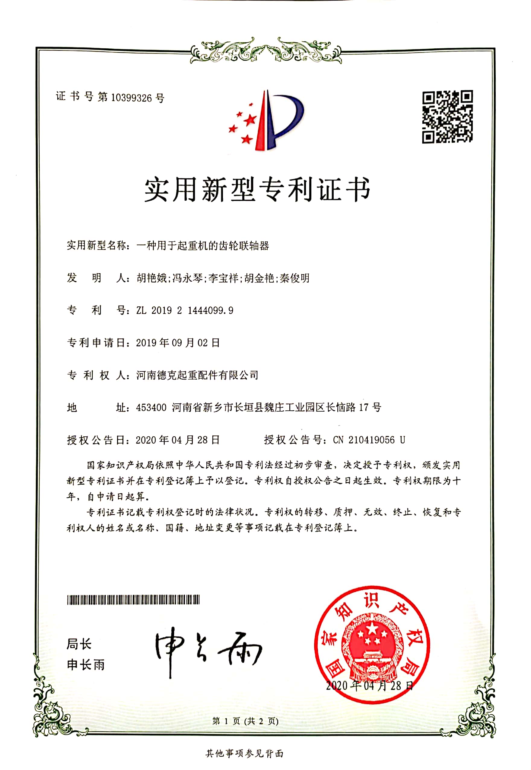 | 發(fā)證機(jī)構(gòu): | 國家知識產(chǎn)權(quán)局 | 發(fā)證時間 : | 2020-04-14 |