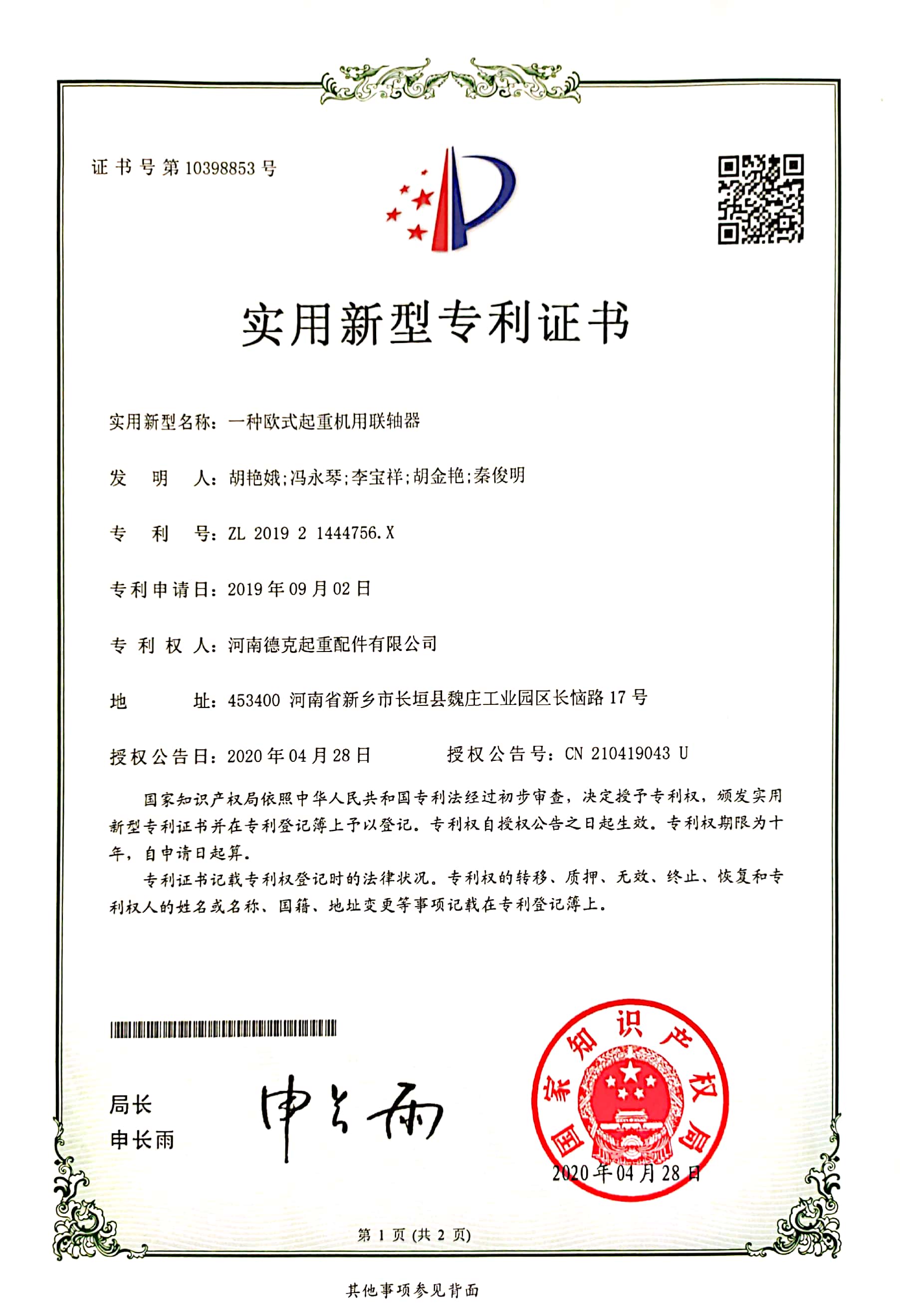 證書介紹 一種歐式起重機(jī)用聯(lián)軸器