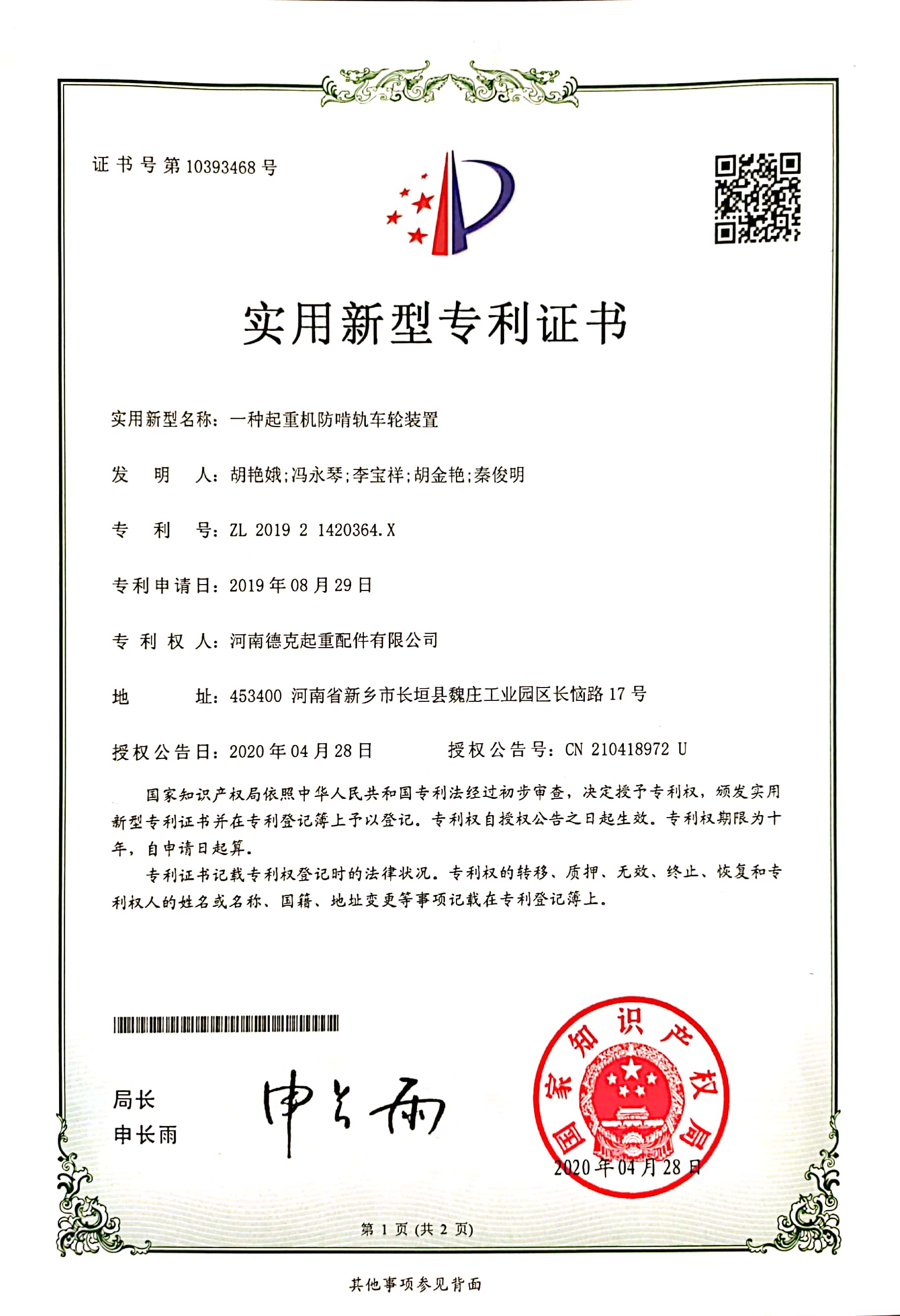 實用新型專利證書