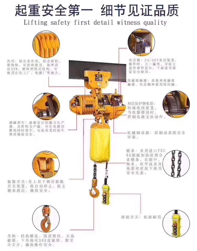 本公司產品品種齊全,質量可靠,價格合理,售后服務周到。還可根據(jù)用戶要求,設計各種非標電動葫蘆和非標起重機。愿本公司的產品,成為貴單位理想的選擇。