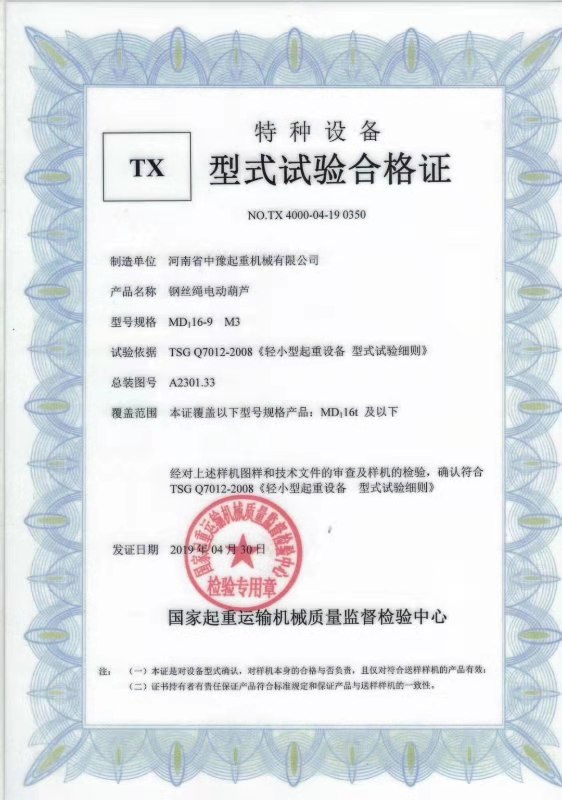 | 發(fā)證機(jī)構(gòu): | 國家起重運(yùn)輸機(jī)械質(zhì)量監(jiān)督檢驗(yàn)中心 | 發(fā)證時(shí)間 : | 2019-04-30 |