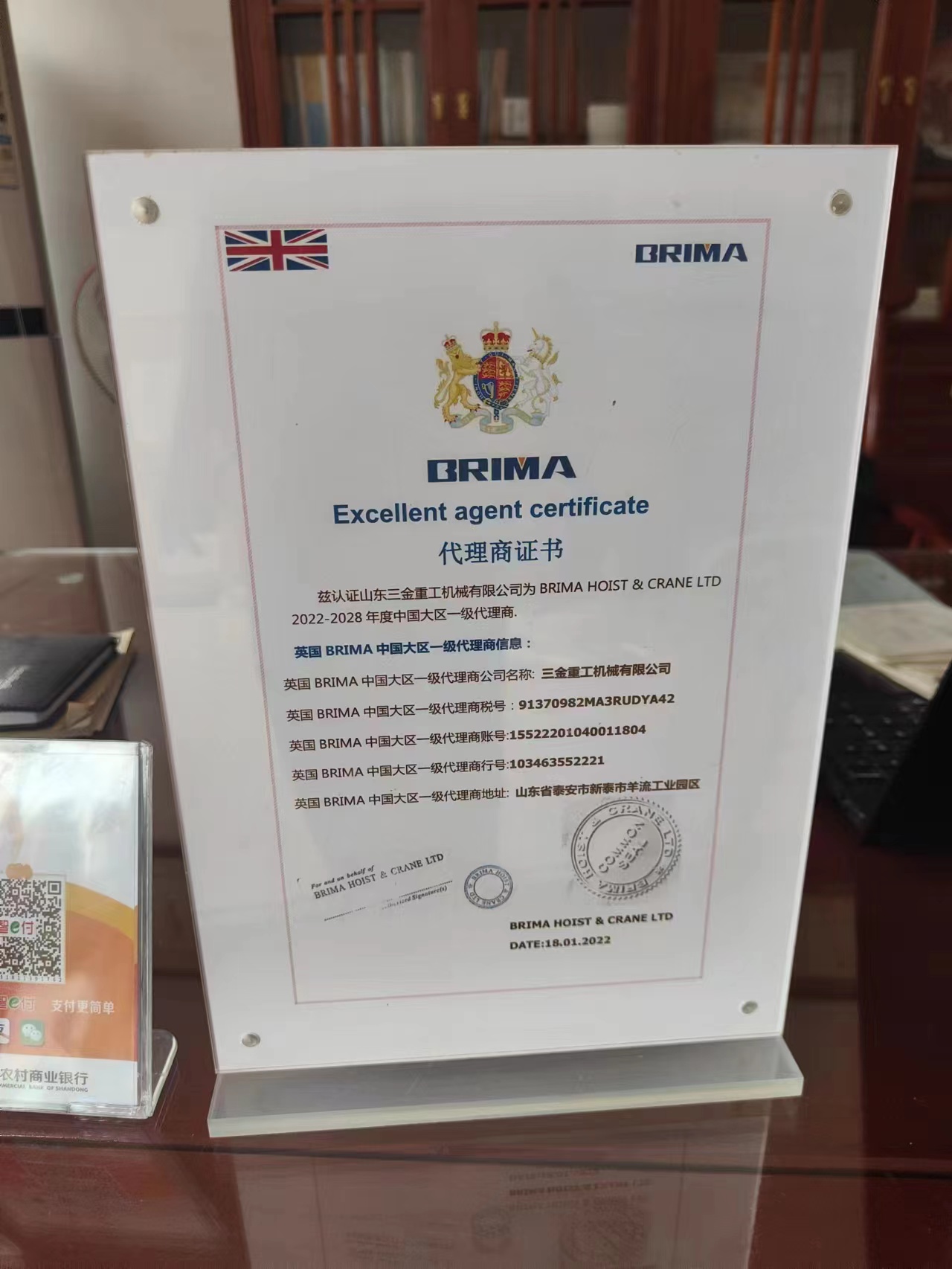 榮譽資質(zhì) BRIMA代理商證書