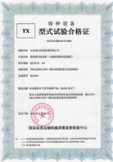 榮譽(yù)資質(zhì) 通用橋式起重機(jī)(電磁掛梁橋式起重機(jī))