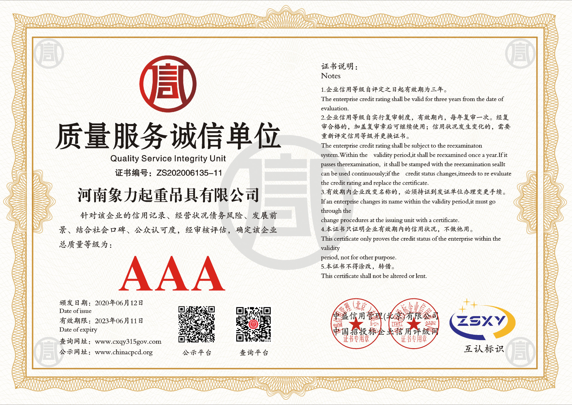 | 發(fā)證機(jī)構(gòu): | 中盛信用管理(北京)有限公司 | 發(fā)證時(shí)間 : | 2020-06-12 |