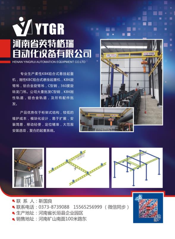 :專業(yè)生產(chǎn)柔性KBK組合式懸掛起重機(jī),剛性KBC組合式懸掛起重機(jī),KBK旋臂吊,鋁合金旋臂吊,C型鋼,360度旋轉(zhuǎn)龍門吊。我公司的優(yōu)勢在于桁架式結(jié)構(gòu),較低的維護(hù)成本,模塊化設(shè)計,易于擴(kuò)展,安裝簡易,移動輕便,