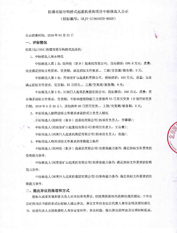 防爆雙梁吊鉤橋式起重機(jī)采購(gòu)項(xiàng)目中標(biāo)候選人公示