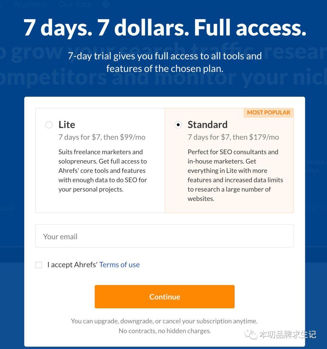 比如:Ahref這種低價限時付費(fèi)試用,看似是全功能的,個人版其實就是部分核心功能的受限制組合,面向的是自由職業(yè)者和個人事業(yè)主,標(biāo)準(zhǔn)版面向的是企業(yè)。