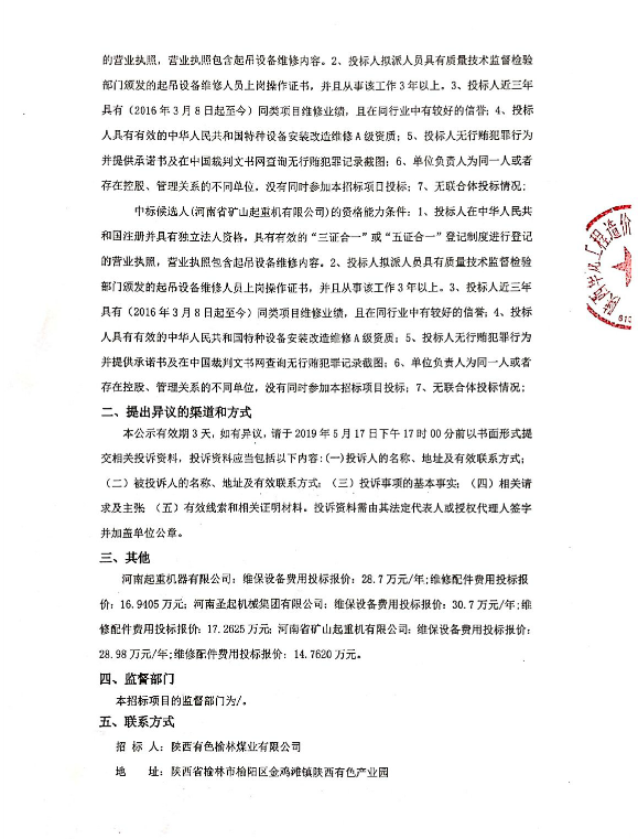 移動版:陜西有色榆林煤業(yè)有限公司起重機及電動葫蘆定期維護保養(yǎng)工程 中標候選人公示