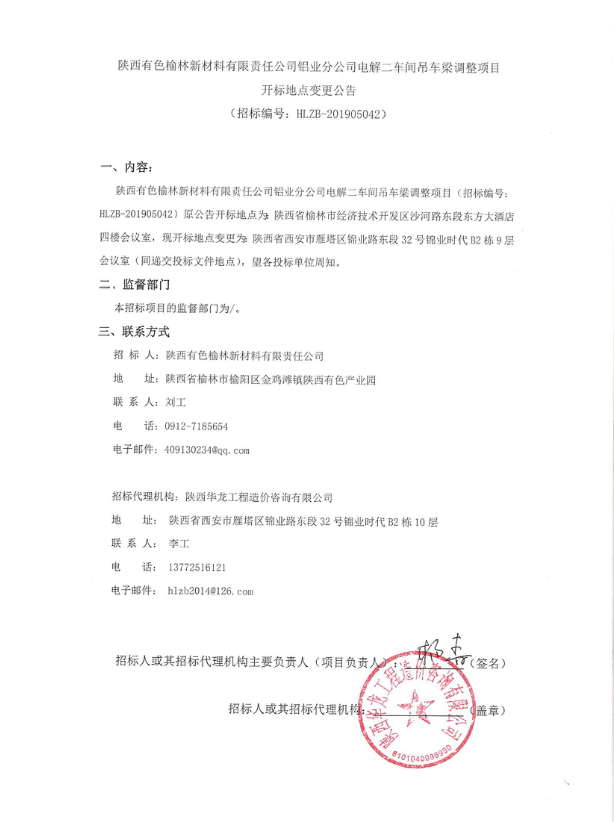 陜西有色榆林新材料有限責(zé)任公司鋁業(yè)分公司電解二車間吊車梁調(diào)整項(xiàng)目 開(kāi)標(biāo)地點(diǎn)變更公告