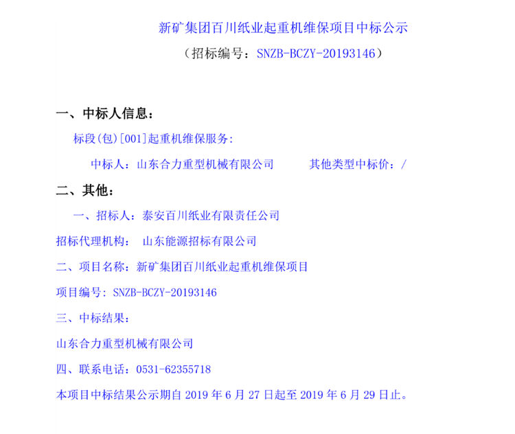 新礦集團百川紙業(yè)起重機維保項目中標(biāo)公示