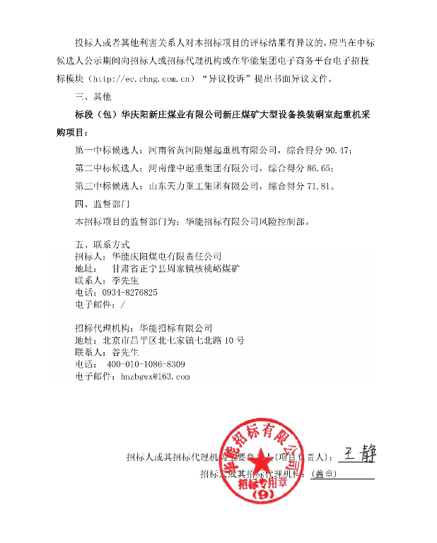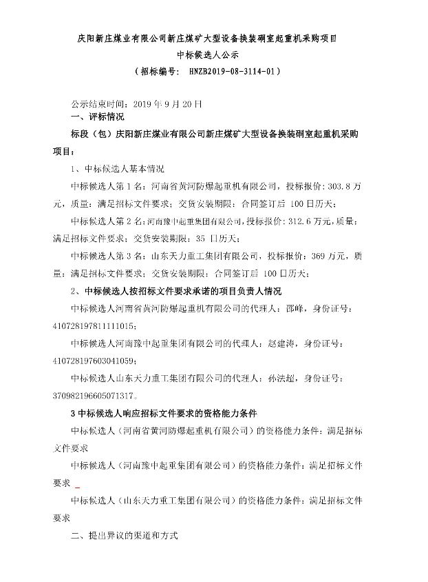 移動版:慶陽新莊煤業(yè)有限公司新莊煤礦大型設(shè)備換裝硐室起重機采購項目中標候選人公示