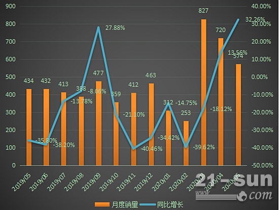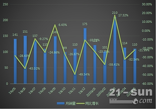 數(shù)據(jù)顯示,2020年5月份,國內主要推土機制造企業(yè)合計銷售推土機574臺,同比增長32.26%,連續(xù)兩個月正增長,且創(chuàng)下近1年來的最高增長幅度。其中標準型和濕地型推土機分別銷售267臺和307臺。2020年1-5月,共銷售推土機2686臺,同比下滑6.18%,降幅繼續(xù)收窄。