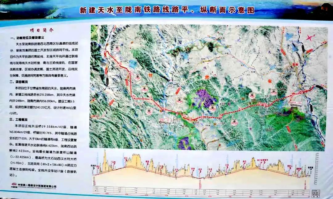 天隴鐵路在甘肅省天水、隴南兩市境內(nèi)。北端銜接天華鐵路楊家碾站,途經(jīng)天水市、成縣,南至隴南市,接入蘭渝鐵路隴南西站。全長(zhǎng)215.258公里,是國(guó)家中長(zhǎng)期鐵路網(wǎng)規(guī)劃和甘肅省“十三五”鐵路發(fā)展規(guī)劃確定的重點(diǎn)項(xiàng)目,也是甘肅省第一條全額投資、自主修建的鐵路工程。
