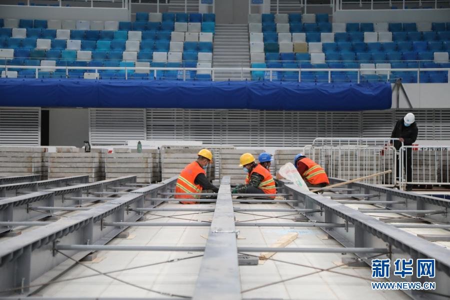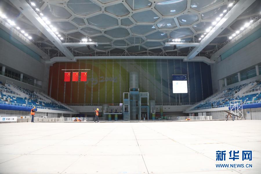 11月27日,工人在國家游泳中心“水立方”比賽大廳進行調(diào)平工作。