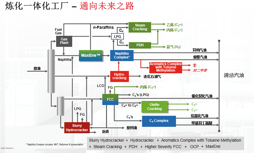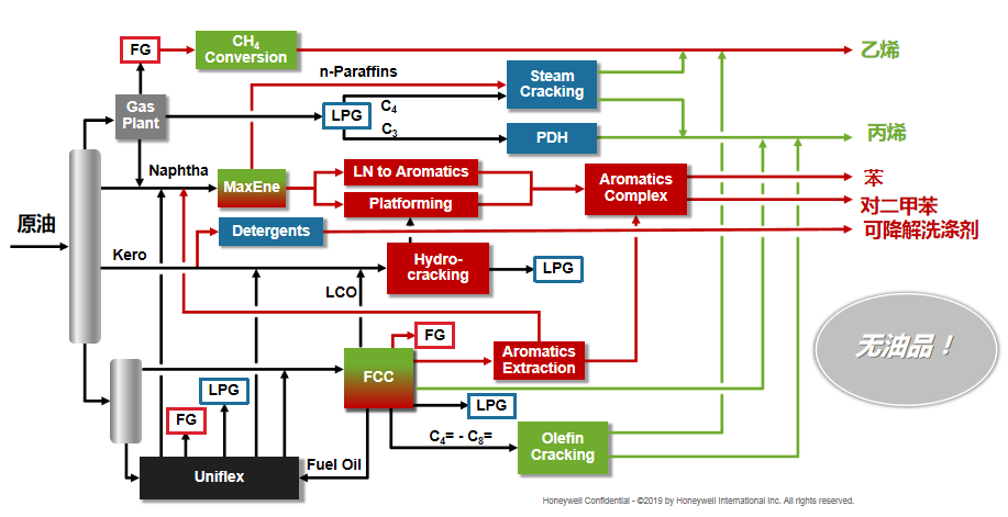 在了解煉廠的生產(chǎn)原理和規(guī)律后,技術(shù)人員又如何將現(xiàn)有多產(chǎn)油品的煉廠改造成多產(chǎn)石化產(chǎn)品的工廠呢?舉個例子,煉廠如果有以生產(chǎn)汽油為主的催化裂化(FCC)裝置,我們可以將其改造成多產(chǎn)丙烯的模式,由FCC出來的C4+烯烴也可以通過烯烴裂解來更進(jìn)一步增產(chǎn)丙烯和乙烯;在煉廠添加芳烴抽提和二甲苯裝置,則可以完成重整從生產(chǎn)高辛烷值汽油到生產(chǎn)芳烴的改造。如果我們將煉廠的重油裝置改為加氫裂解的UNIFLEX裝置,就可以將95%以上的碳回收成輕油,這些輕油可以通過裂解反應(yīng)生產(chǎn)石化產(chǎn)品的原料。催化裂化的循環(huán)油由于本身含有芳環(huán)也可以用來直接去生產(chǎn)芳烴。