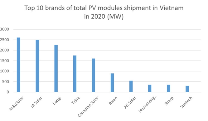 越南MOIT與Clean Energy Associate官方媒體Vietnam Energy Online近日發(fā)布2020年越南組件出貨量市場報告,數(shù)據(jù)統(tǒng)計顯示,晶科能源以超過2.5GW的銷量,連續(xù)第三年穩(wěn)居越南市占第一。晶澳,隆基分列第二、第三,阿特斯,東方日升,新源,東方環(huán)晟,夏普,尚德緊隨其后。