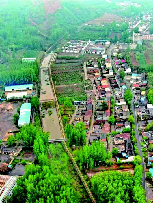 河南省“全國(guó)文明村”河口村人工濕地污水流入的燕溝河(4月25日攝,無(wú)人機(jī)照片)。新華社記者 劉詩(shī)平 攝