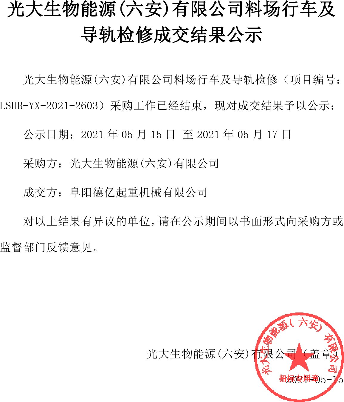 移動(dòng)版:安徽:光大生物能源(六安)有限公司料場(chǎng)行車(chē)及導(dǎo)軌檢修成交結(jié)果公示