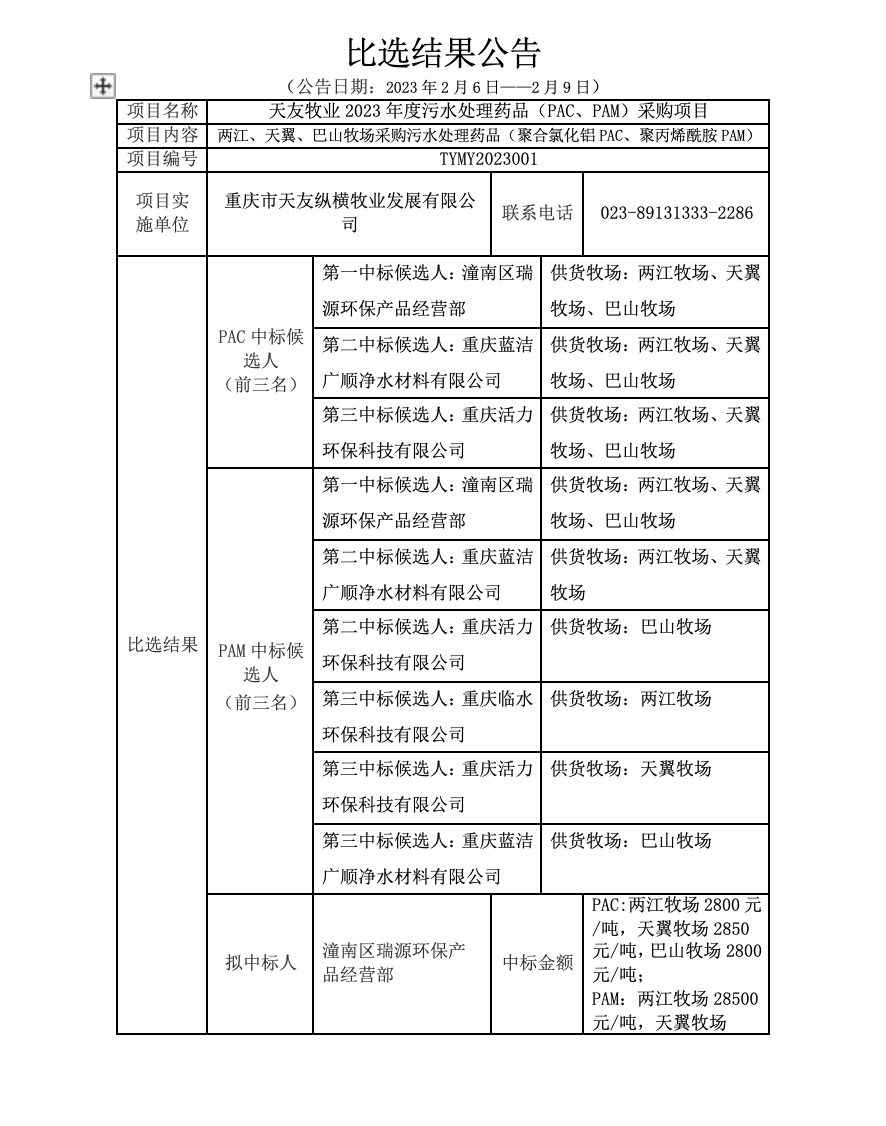 移動(dòng)版:天友牧業(yè)2023年度污水處理藥品(PAC、PAM)采購項(xiàng)目比選結(jié)果公示