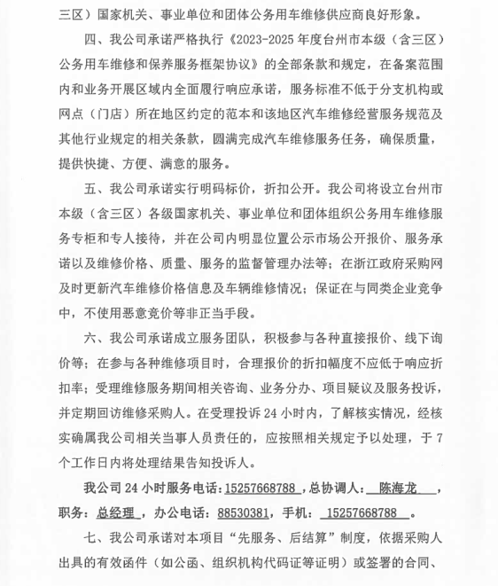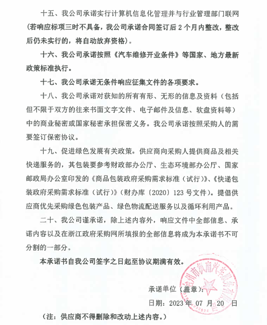 | 一、二類維修供應(yīng)商(綜合修理類) | 臺(tái)州市楓南汽車服務(wù)有限公司一、二類維修供應(yīng)商(綜合修理類) | 承諾書(shū):