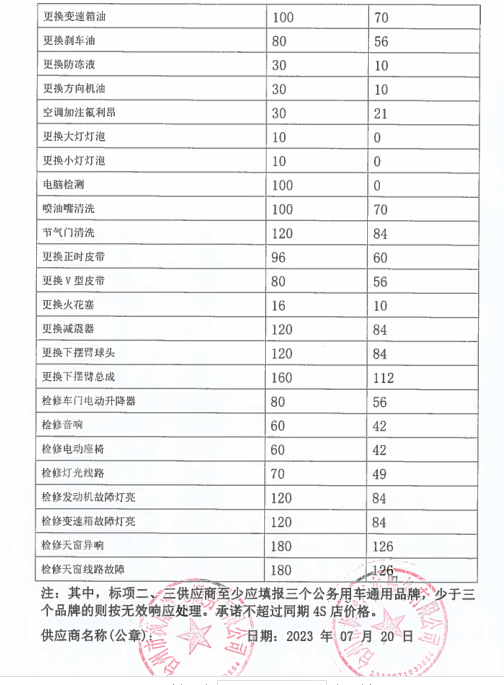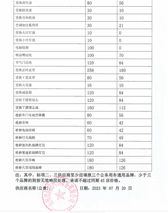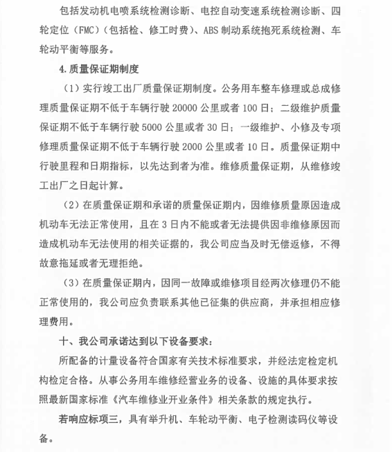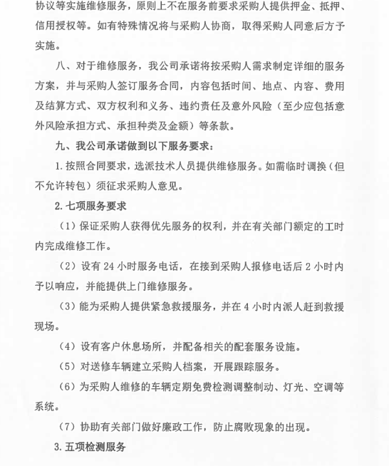 一、定點(diǎn)維修保養(yǎng)服務(wù) 1、承諾維修時(shí)限:大修7天內(nèi);二級(jí)維護(hù)2天內(nèi);一級(jí)維護(hù)1天內(nèi)完成。 2、設(shè)有24小時(shí)服務(wù)電話:0576-88530391 15868698695及提供服務(wù),并能為送修方提供緊急救援搶修服務(wù),在臺(tái)州市15公里范圍內(nèi)半小時(shí)內(nèi)派人趕到救援現(xiàn)場(chǎng),臺(tái)州范圍內(nèi)非城區(qū)和標(biāo)段區(qū)域外2小時(shí)內(nèi)派人趕到救援現(xiàn)場(chǎng)。 3、椒江城區(qū)免費(fèi)拖車及施救。 4、為甲方定期保養(yǎng)的車輛免費(fèi)辦理車檢服務(wù)。 5、車輛基礎(chǔ)裝潢,改裝裝璜服務(wù):更換各種舒適航空座椅、重新包座椅、星空頂或者其他車頂、手動(dòng)電動(dòng)窗簾、重包內(nèi)飾板、實(shí)木地板、改裝移動(dòng)辦公用車等。也可根據(jù)貴單位實(shí)際需求改裝。 6、對(duì)甲方的送修車輛建立用戶檔案,做到“一車一檔”,開(kāi)展跟蹤服務(wù)、提醒服務(wù)。每月5號(hào)前及時(shí)更新數(shù)據(jù)并上報(bào)甲方車輛管理員。 二、其它服務(wù)承諾 1、為定點(diǎn)維修單位客戶提供“宅捷修”服務(wù),(專業(yè)技師及服務(wù)顧問(wèn)上門(mén)接修和估價(jià),回廠進(jìn)一步檢查報(bào)價(jià),客戶確認(rèn)后維修,經(jīng)技師自檢、互質(zhì)檢員完檢檢驗(yàn)完美送車)。 2、公司本部在臺(tái)州市經(jīng)中路1015號(hào),在黃焦濱海設(shè)有分部,為公務(wù)用車提供方便快捷的服務(wù) 3、事故出險(xiǎn)承諾全程免費(fèi)協(xié)助事故查勘、定損、理賠等服務(wù) 4、提供免費(fèi)洗車服務(wù) 5、事故車維修除不可控因素外的維修時(shí)間,可根據(jù)需要提供代步車 6、事故出險(xiǎn)乙方可以提供車輛接送服務(wù),也可提供代步車。 7、在我公司維修車輛的,無(wú)論維修多少維修時(shí)長(zhǎng),都可提供代步車服務(wù)。 8、承諾甲方員工的私人車輛按自愿的原則到乙方維修保養(yǎng)。員工的車輛同等享受中選結(jié)果的價(jià)格、服務(wù)條款,費(fèi)用由員工自行支付。 9、享受每年2次的車輛安全檢測(cè),同時(shí)提供與車輛節(jié)能使用、安全駕駛等相關(guān)事項(xiàng)的愛(ài)車課堂講座。 10、免費(fèi)代辦車輛報(bào)廢服務(wù)(包括協(xié)議單位私家車)。 11、協(xié)議單位私家車維修憑工作證免工時(shí)(鈑金油漆打五折)一次。 12、提供送水、搭電、換胎等服務(wù) 13、代為貴單位質(zhì)保期內(nèi)車輛的首保索賠及其他需回原廠維修事務(wù) 14、免費(fèi)更換玻璃水含材料 15、設(shè)有24小時(shí)技術(shù)服務(wù)電話:88530391、88530392、15868698695??蛻艨赏ㄟ^(guò)電話對(duì)車輛維修檔案、技術(shù)參數(shù)、故障、性能、年檢等車輛有關(guān)情況進(jìn)行咨詢。 16、為更好的全面周到的服務(wù)于協(xié)議單位,我司可根據(jù)協(xié)議單位車輛規(guī)模提供升降機(jī),安裝在協(xié)議單位提供的維修場(chǎng)地。并配備一定量的維修工具及常用配件。 17、我司還可根據(jù)協(xié)議單位維修量需要派駐點(diǎn)人員。 18、本公司可為協(xié)議單位提供的特色服務(wù),可為協(xié)議單位安裝公司維修管理軟件的客戶端,可使協(xié)議單位實(shí)時(shí)了解車輛維修情況。其具有強(qiáng)大的查詢功能,并且可通過(guò)因特網(wǎng)實(shí)時(shí)更新貴單位在本公司的維修等情況的數(shù)據(jù)。具體介紹如下: 維修管理軟件客戶端的詳細(xì)介紹 本公司的維修管理軟件不但可以對(duì)在本公司維修的車輛進(jìn)行維修管理,公司通過(guò)聯(lián)網(wǎng)電腦對(duì)客戶的維修進(jìn)行全程、系統(tǒng)的管理。從進(jìn)廠區(qū)到竣工出廠的每一環(huán)節(jié)都通過(guò)微機(jī)間的數(shù)據(jù)傳遞進(jìn)行管理,并保存每一環(huán)節(jié)的車輛維修等情況的實(shí)時(shí)記錄。為客戶建立了車輛基本情況、運(yùn)行狀況及維修歷史、實(shí)時(shí)情況、客戶需要等的詳細(xì)完備的檔案資料。能根據(jù)不同客戶需要隨時(shí)、快捷地調(diào)閱車輛的各類檔案及統(tǒng)計(jì)資料。 還可為貴單位建立客戶端,可通過(guò)因特網(wǎng)將貴單位在本公司的車輛維修情況等數(shù)據(jù)導(dǎo)入貴單位自已的電腦上。 客戶端具有主控端一樣的功能,可查詢車輛的基本情況、維修歷史、實(shí)時(shí)的情況;也可查詢單輛車單次、多次的維修情況;也可統(tǒng)查某一輛車的所有維修情況、所有更換的配件情況;還可根據(jù)不同的時(shí)間段、不同的車屬單位進(jìn)行查詢等。 本公司客戶端軟件查詢對(duì)話如下: