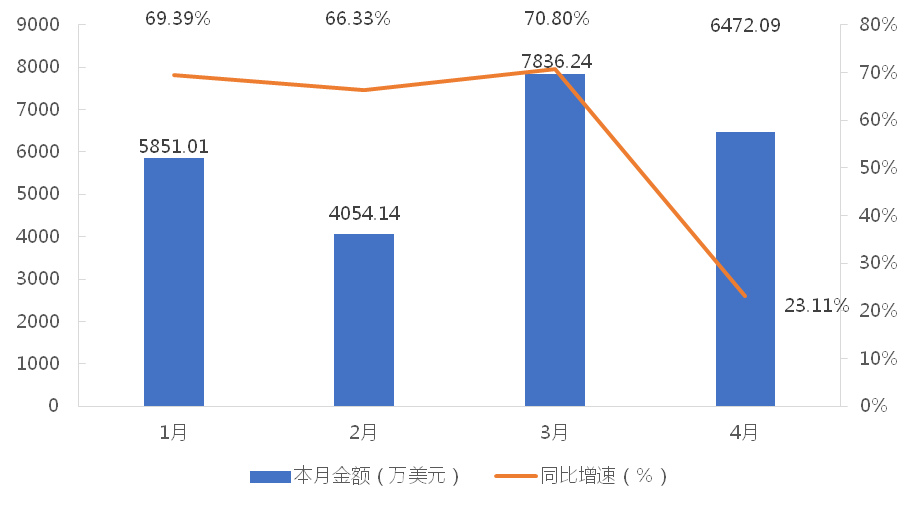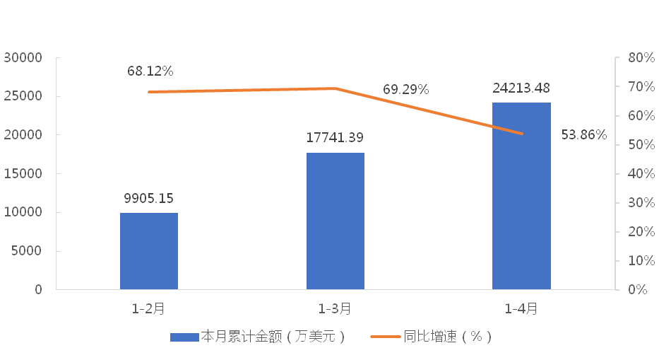 1-4月,我國塔式起重機累計出口金額為24213.48萬美元,同比增長53.86%;累計出口數(shù)量為2165臺,同比增長46.88%;出口均價為11.18萬美元/臺,同比增長4.68%。