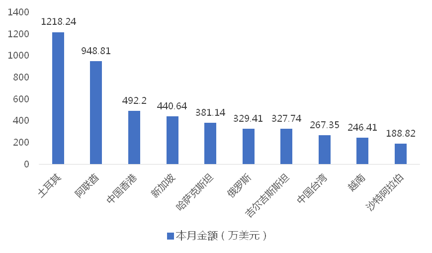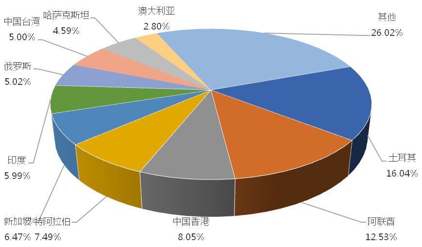 2025年4月,我國塔式起重機出口金額排名前十位的國家/地區(qū)分別為土耳其、阿聯(lián)酋、中國香港、新加坡、哈薩克斯坦、俄羅斯、吉爾吉斯斯坦、中國臺灣、越南、沙特阿拉伯,合計占我國該產(chǎn)品出口總額的74.79%。其中,向土耳其出口最多,金額為1218.24萬美元,占出口總額的18.82%。