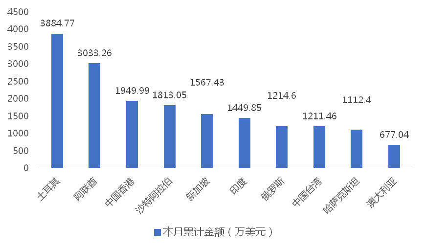 1-4月,我國塔式起重機出口金額排名前十的國家/地區(qū)分別為土耳其、阿聯(lián)酋、中國香港、沙特阿拉伯、新加坡、印度、俄羅斯、中國臺灣、哈薩克斯坦、澳大利亞,合計占我國該產(chǎn)品出口總額的73.98%。其中,向土耳其出口最多,金額為3884.77萬美元,占出口總額的16.04%。