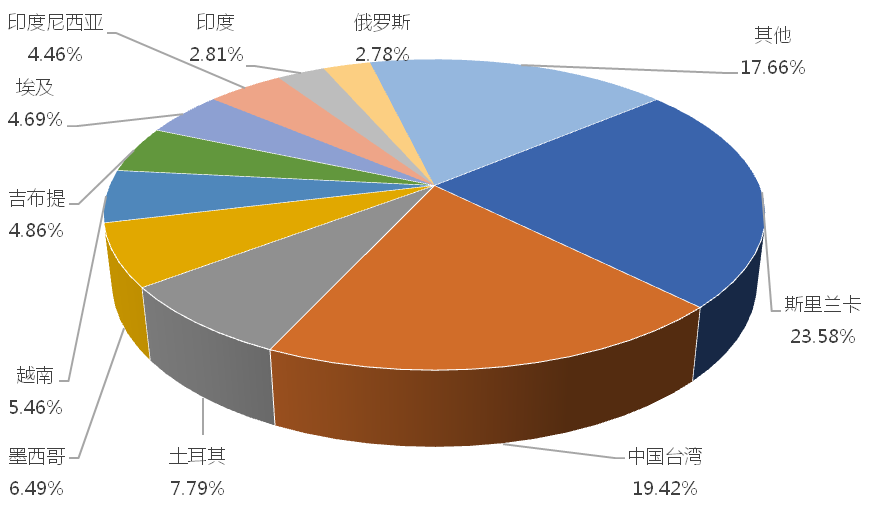 1-6月,我國龍門式起重機(jī)出口金額排名前十的國家/地區(qū)分別為斯里蘭卡、中國臺灣、土耳其、墨西哥、越南、吉布提、埃及、印度尼西亞、印度、俄羅斯,合計占我國該產(chǎn)品出口總額的82.34%。其中,向斯里蘭卡出口最多,金額為8351.06萬美元,占出口總額的23.58%。