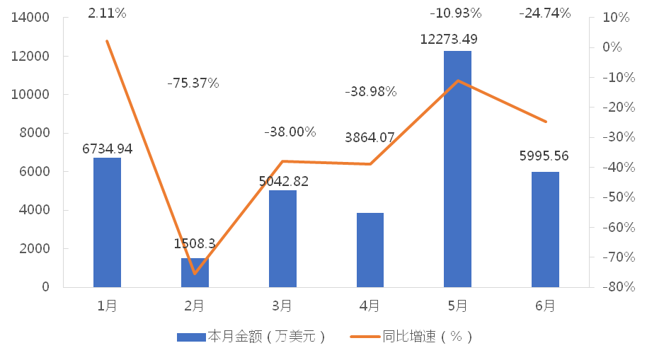 1-6月,我國龍門式起重機(jī)累計出口金額為35419.18萬美元,同比下降27.61%;累計出口數(shù)量為2216臺,同比增長13.47%;出口均價為15.98萬美元/臺,同比下降36.21%。